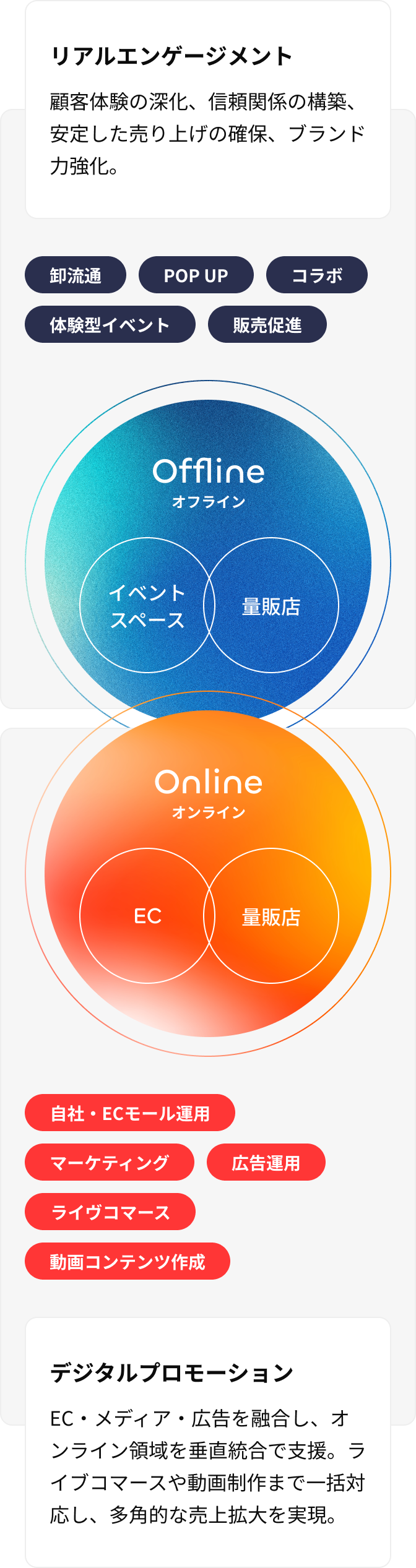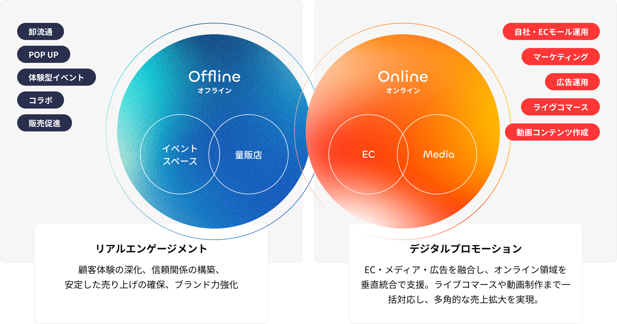 オンラインとオフラインの二つの成長導線を同時に回し、相互に補完し合うことで、持続的に加速する成長のフライホイールを構築します。